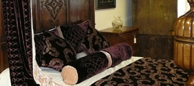 Our displays demonstrate custom made striking silk and velvet lined bed runners, luxurious trimmed edge curtains, with matching accessories and a selection of beautiful feather filled cushions, including large Bolster cushions, feather filled Box pillows, Piped and trimmed cushions.